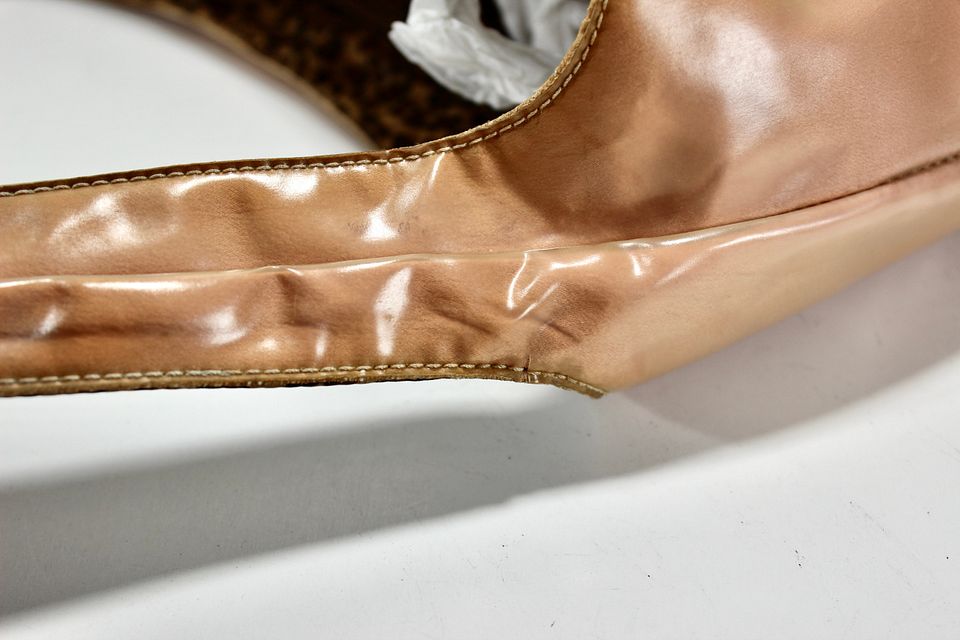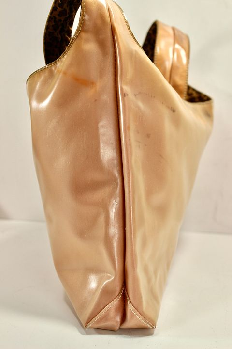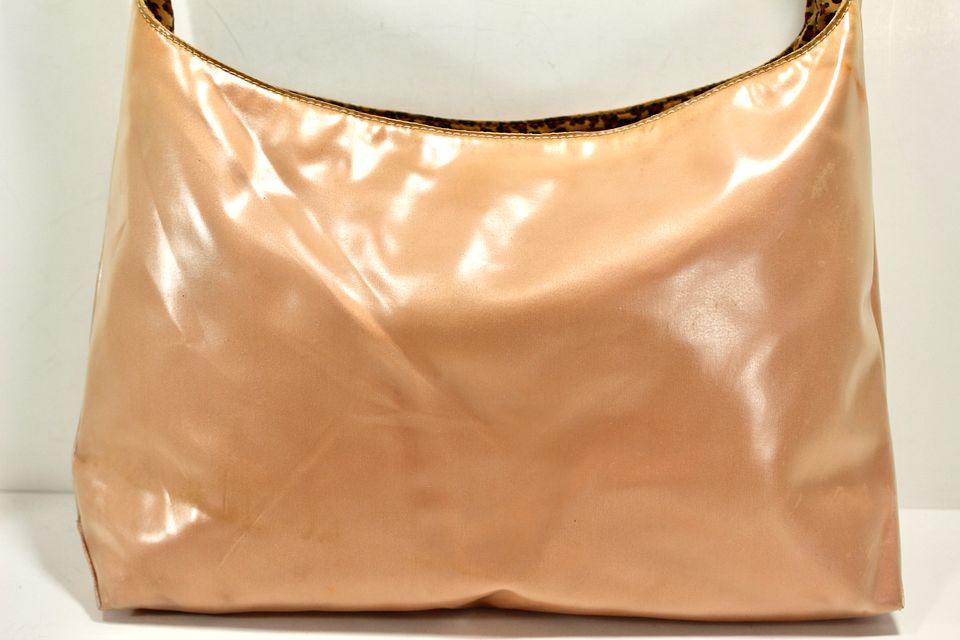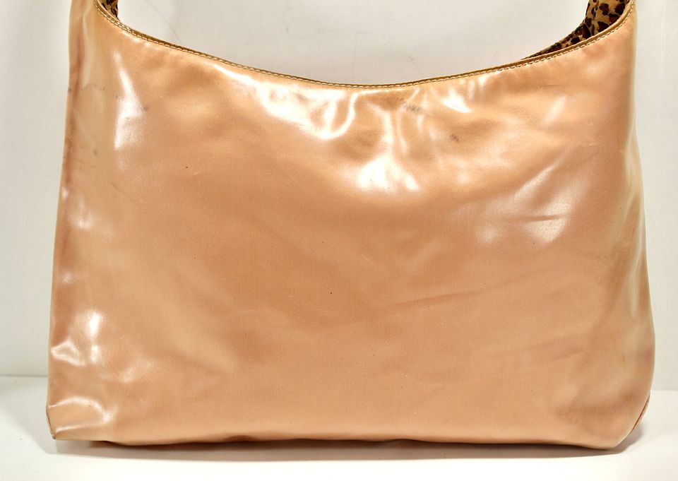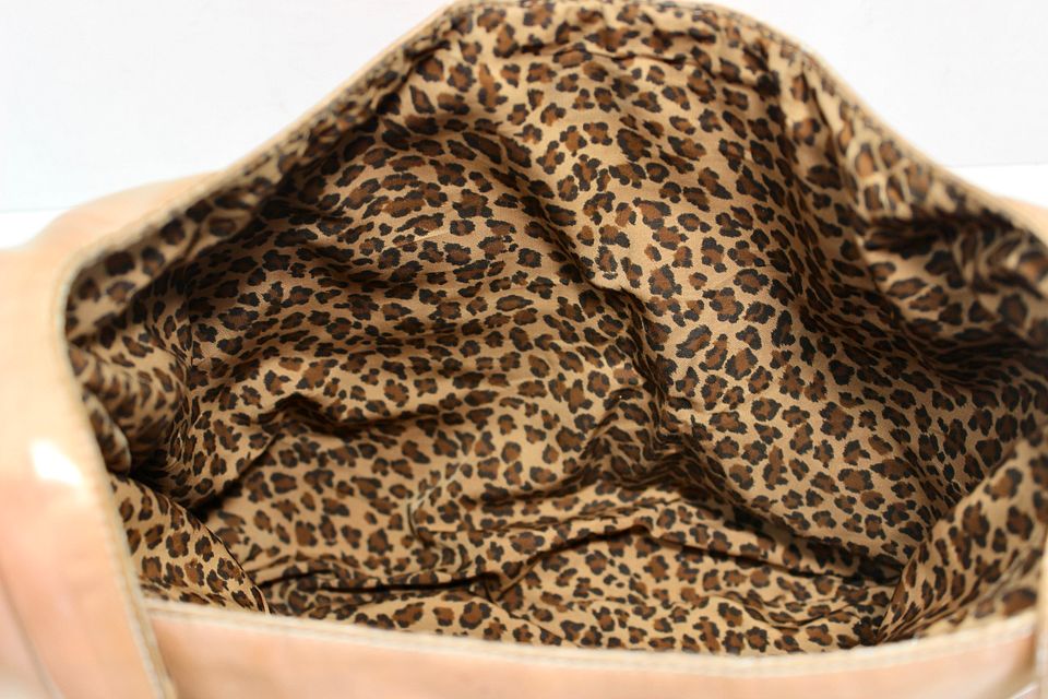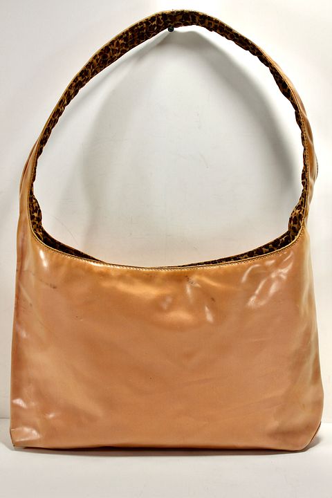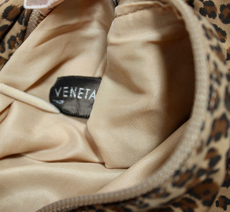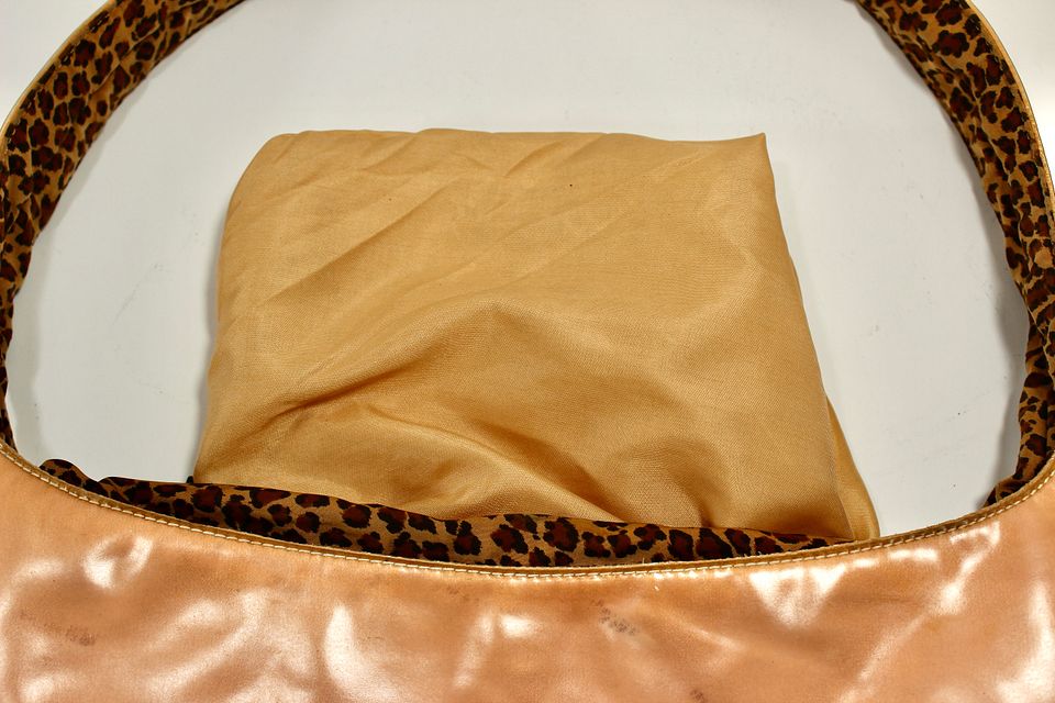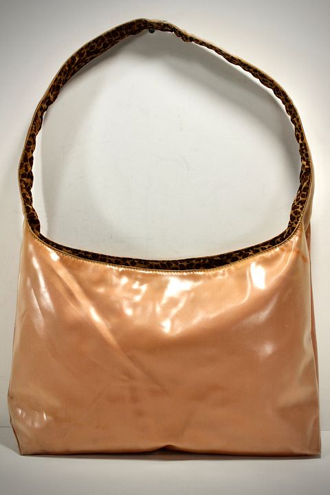 Vintage BOTTEGA VENETA pink hobo hand bag with clear vinyl covering and fabric leopard print inside lining, inside zip pocket, no top closure. Serial nos on originality tag are: 10552705246LRN, 9G00077715G91, 901899, made in Italy.
