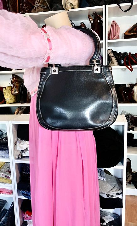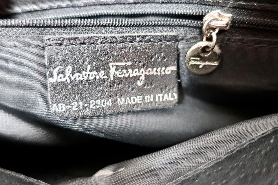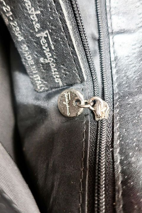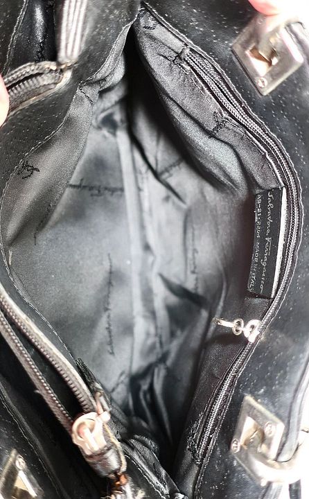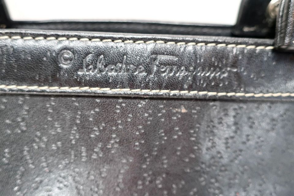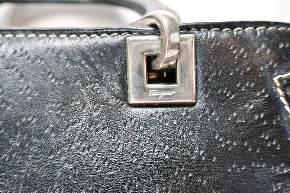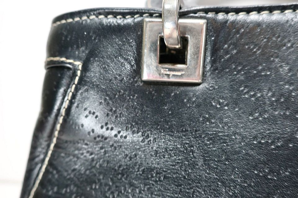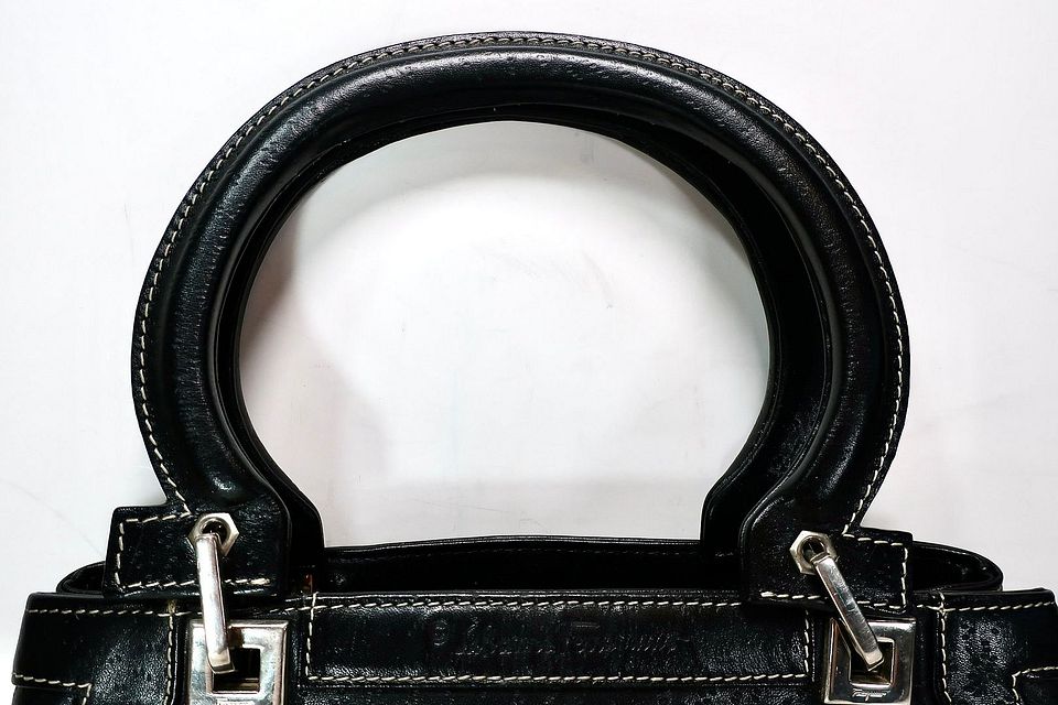 Vintage SALVATORE FERRAGAMO black textured leather dual leather handle hand bag or tote. Gancini design top handles. Inside 3 pocket design with two open pockets and zip center pocket, side inside zip pocket, fabric logo inside lining. Silver color hardware, no. on tag is AB-21 2304, made in Italy.